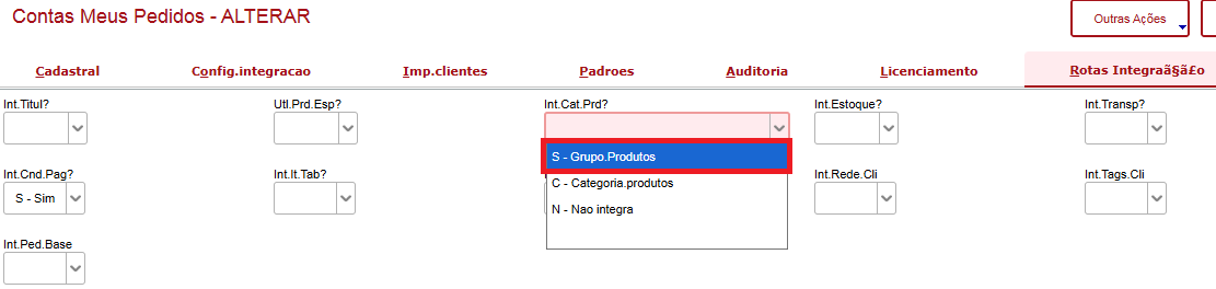 Para que Grupos de Produtos sejam integrados, deve-se entrar no cadastro de Contas da integração e marcar o campo “Int. Cat. Prod?” como S - Grupo.Produtos, conforme a imagem acima.
