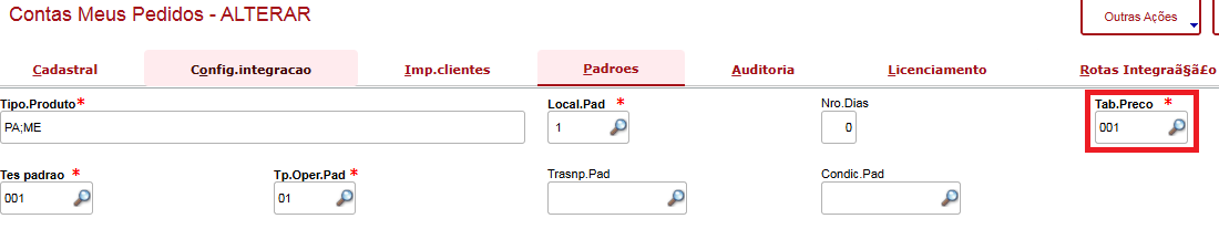 Essa tabela de preço padrão deve ser informada na configuração da Conta, no campo "Tab.Preco" conforme imagem acima.