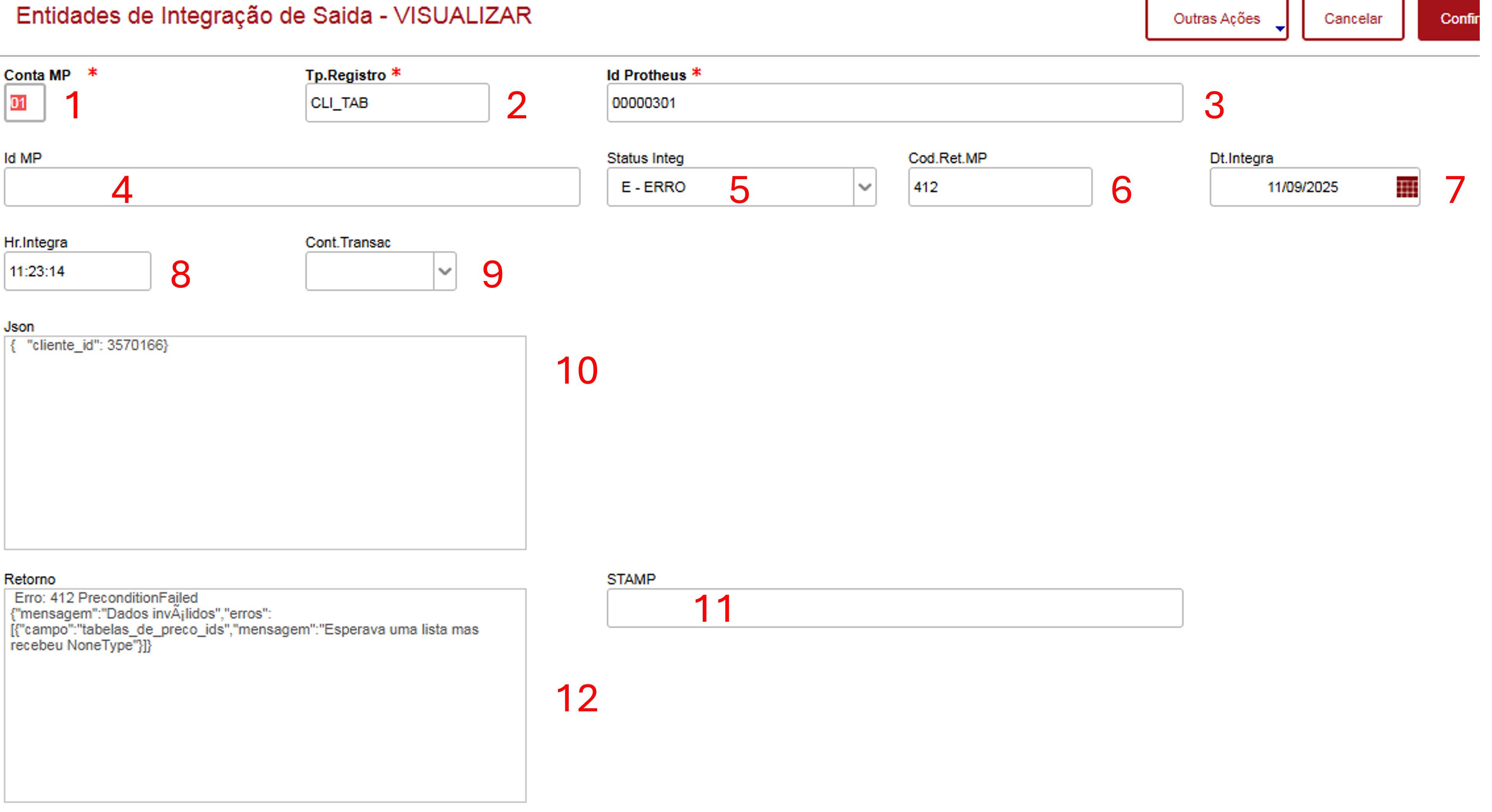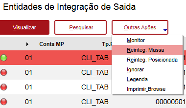 Sempre que ocorrer algum erro de integração com algum item, este ficará parado até o problema ser corrigido. Após a correção do problema, a entidade deve ser reintegrada.